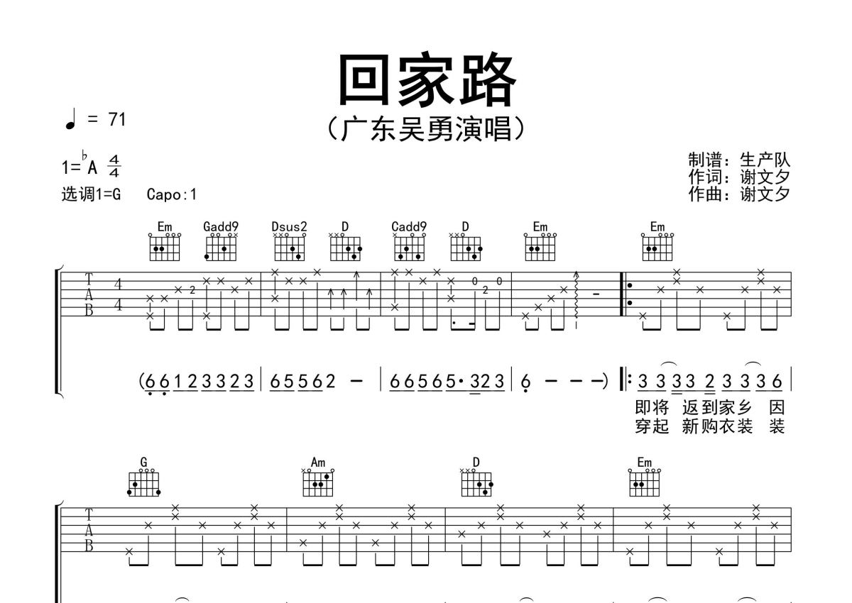 《回家路》是广东吴勇演唱的一首歌曲,精编完美版,拍号为4/4拍,歌曲速度为每分钟71拍,歌曲原调为Ab调,但由于原调指法比较难,为了方便弹奏,本吉他谱采用的是G调指法编配,变调夹1品弹奏即为原调,当然也可以根据自己的音域改变变调夹位置,或者通过改变和弦调性,以方便自己弹奏,这份吉他谱共有两张高清图谱,图谱由 @生产队 编配上传,图谱使用六线谱编配,包含吉他和弦指法、简谱以及歌词部分,使用这份回家路吉他谱,可以让你更加方便地掌握这首歌曲的弹唱技巧,快来尝试吧。广东吴勇演唱的歌曲《回家路》原版吉他谱,完整的前奏、间奏solo编配,值得推荐!。
