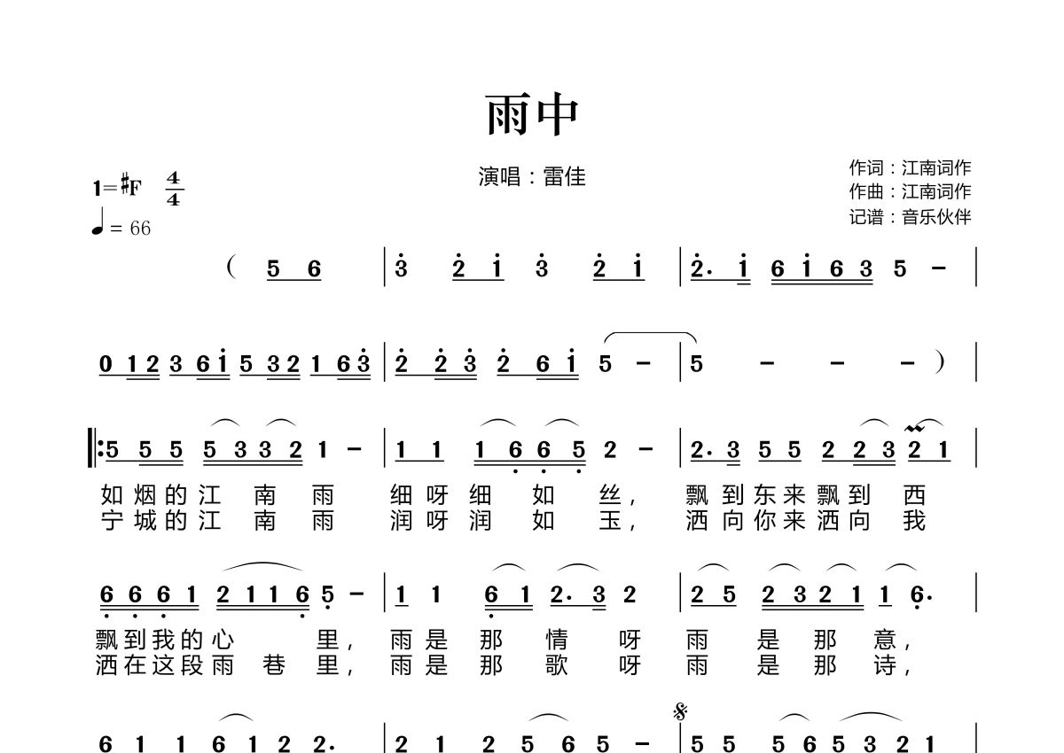 《雨中》是雷佳演唱的一首歌曲,拍号为4/4拍,歌曲速度为每分钟66拍,这份简谱共有两张高清图谱,图谱由 @音乐伙伴 编配上传。