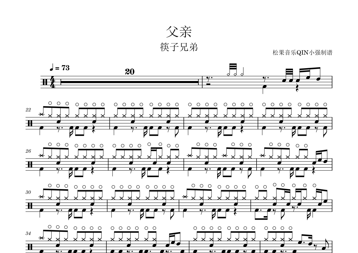 《父亲》是筷子兄弟演唱的一首歌曲,拍号为4/4拍,这份架子鼓谱共有两张高清图谱,图谱由 @松果音乐QIN小强 编配上传,图谱使用五线谱编配,使用这份父亲架子鼓谱,你将能够轻松地敲打出这首筷子兄弟的父亲,快来尝试吧。《父亲》是由王太利作词、作曲,筷子兄弟演唱的歌曲,收录于2011年12月20日筷子兄弟发行的专辑《父亲》中 。该歌曲是微电影《父亲》的主题曲。