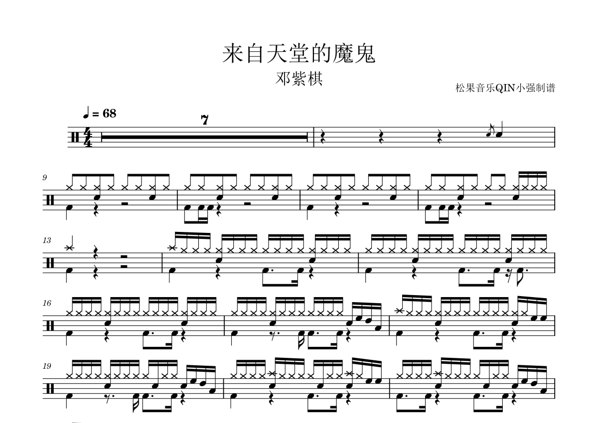 《来自天堂的魔鬼》是邓紫棋演唱的一首歌曲,拍号为4/4拍,这份架子鼓谱共有两张高清图谱,图谱由 @松果音乐QIN小强 编配上传,图谱使用五线谱编配,使用这份来自天堂的魔鬼架子鼓谱,你将能够轻松地敲打出这首邓紫棋的来自天堂的魔鬼,快来尝试吧。《来自天堂的魔鬼》是邓紫棋演唱的歌曲,由邓紫棋作词、作曲,收录于邓紫棋2015年11月6日发行的音乐专辑《新的心跳》中。