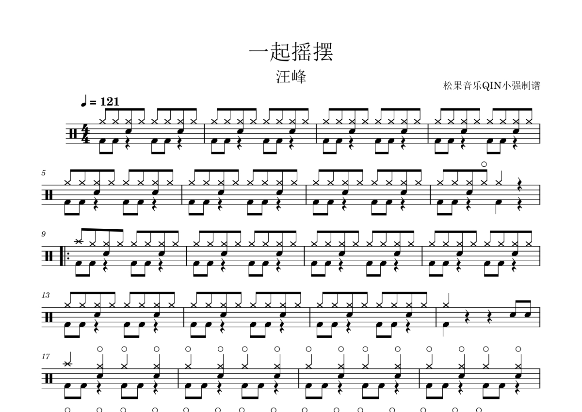 《一起摇摆》是汪峰演唱的一首歌曲,拍号为4/4拍,这份架子鼓谱共有两张高清图谱,图谱由 @松果音乐QIN小强 编配上传,图谱使用五线谱编配,使用这份一起摇摆架子鼓谱,你将能够轻松地敲打出这首汪峰的一起摇摆,快来尝试吧。《一起摇摆》是由汪峰作词、作曲并演唱的歌曲,发行于2013年10月2日,收录于汪峰同年发行的专辑《生来彷徨》中。 2013年11月30日,该曲获得音乐先锋榜2013年度颁奖典礼年度内地十大先锋金曲。