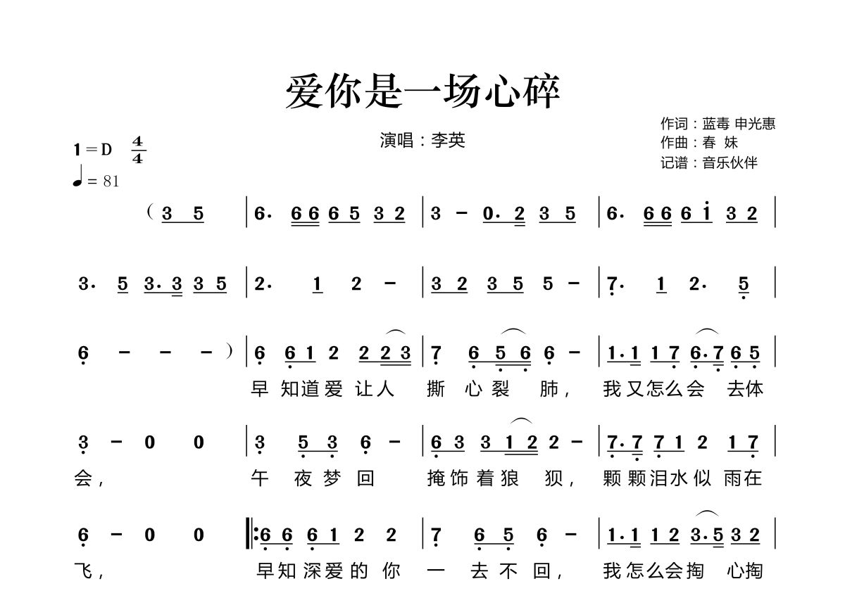 《爱你是一场心碎》是李英演唱的一首歌曲,拍号为4/4拍,歌曲速度为每分钟81拍,这份简谱共有两张高清图谱,图谱由 @音乐伙伴 编配上传。