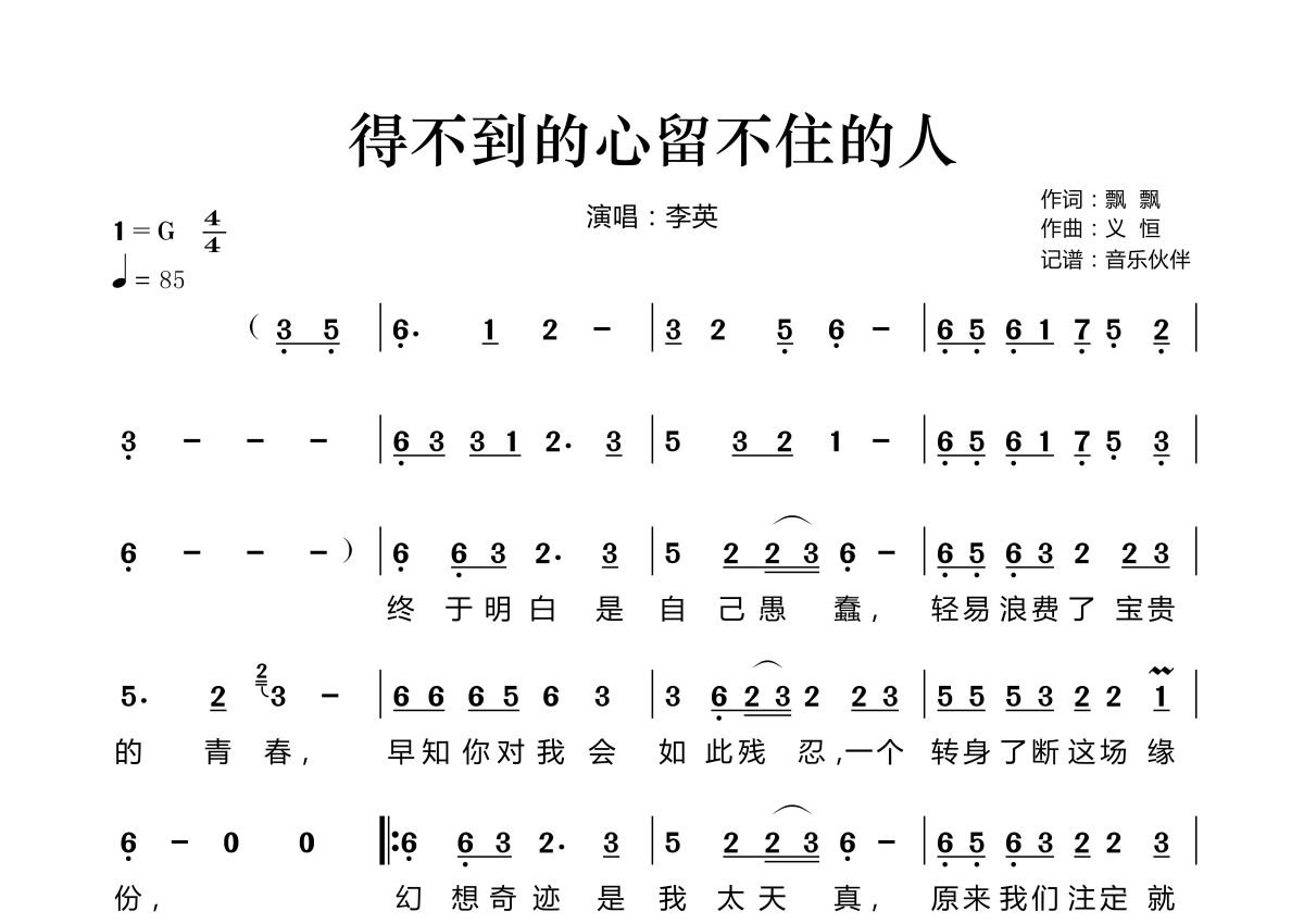 《得不到的心留不住的人》是李英演唱的一首歌曲,拍号为4/4拍,歌曲速度为每分钟85拍,这份简谱共有两张高清图谱,图谱由 @音乐伙伴 编配上传。