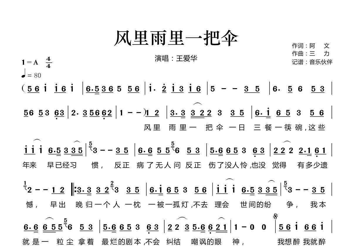 《风里雨里一把伞》是王爱华演唱的一首歌曲,这份简谱共有一张高清图谱,图谱由 @音乐伙伴 编配上传。