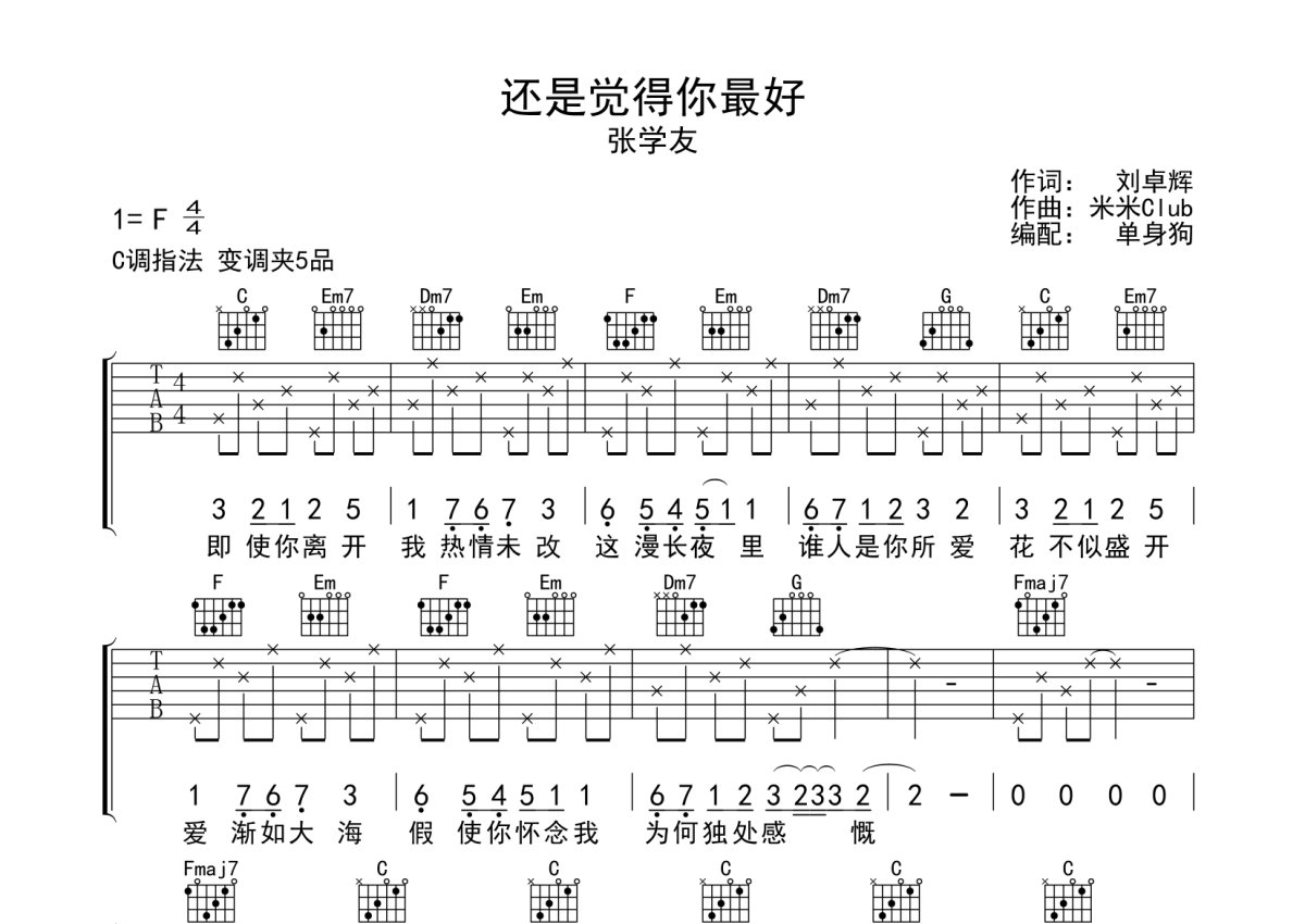 张学友《还是觉得你最好》吉他谱 - C调弹唱六线谱