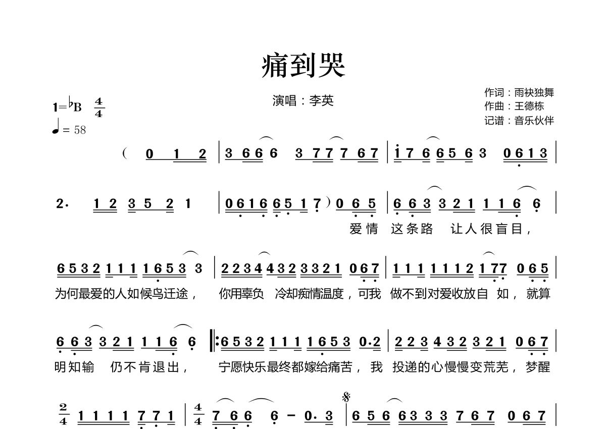 《痛到哭》是李英演唱的一首歌曲,拍号为4/4拍,歌曲速度为每分钟58拍,这份简谱共有一张高清图谱,图谱由 @音乐伙伴 编配上传。