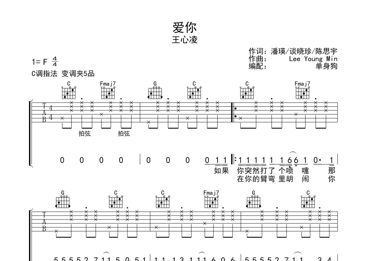 王心凌《爱你》吉他谱 - C调弹唱六线谱
