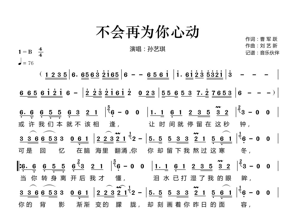 《不会再为你心动》是孙艺琪演唱的一首歌曲,这份简谱共有一张高清图谱,图谱由 @音乐伙伴 编配上传。