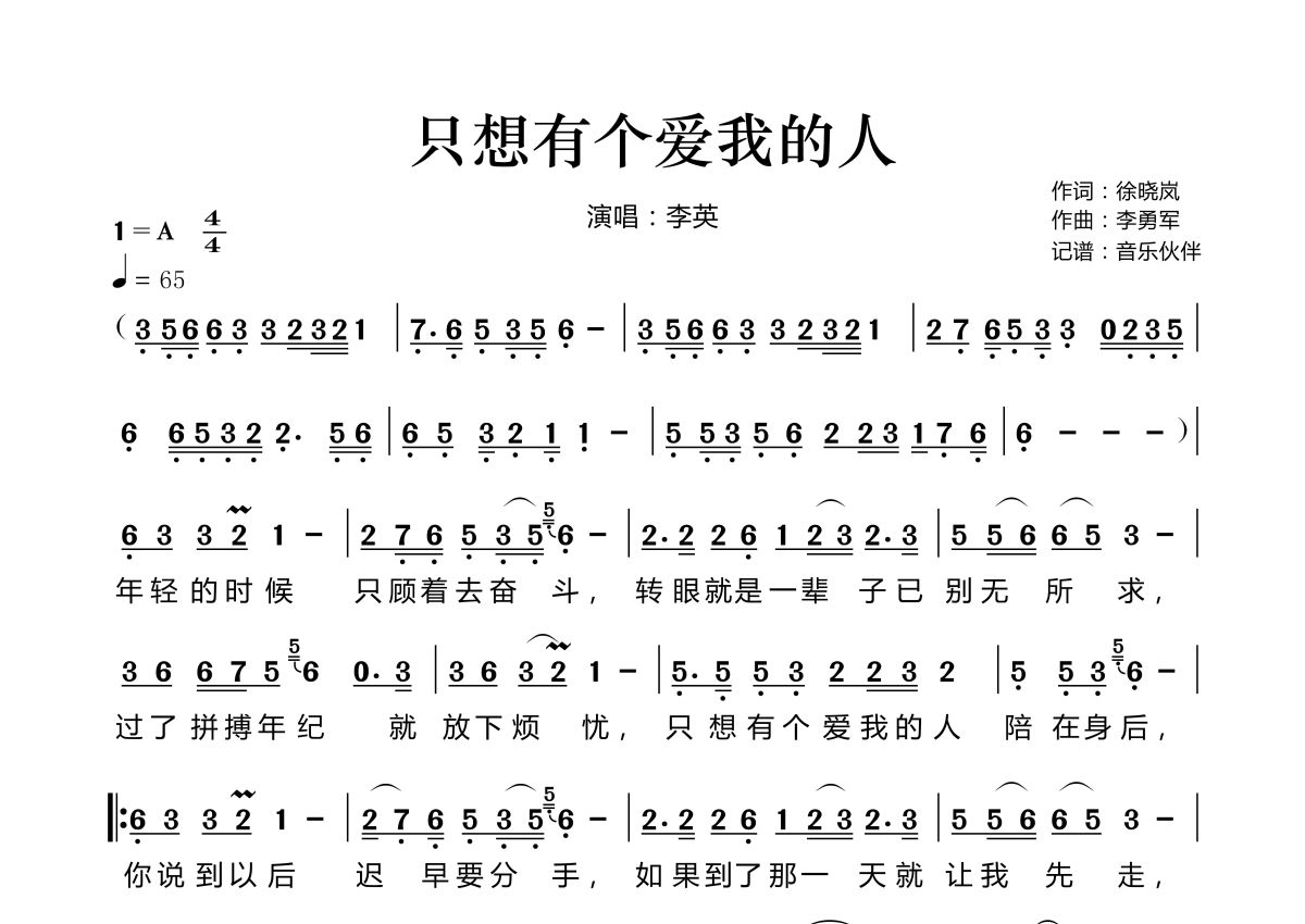 《只想有个爱我的人》是李英演唱的一首歌曲,拍号为4/4拍,歌曲速度为每分钟65拍,这份简谱共有两张高清图谱,图谱由 @音乐伙伴 编配上传。