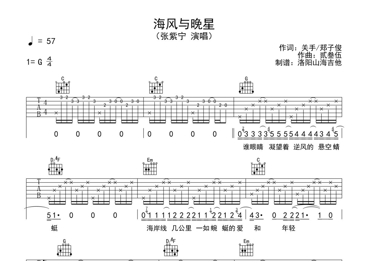 张紫宁《海风与晚星》吉他谱 - G调弹唱六线谱