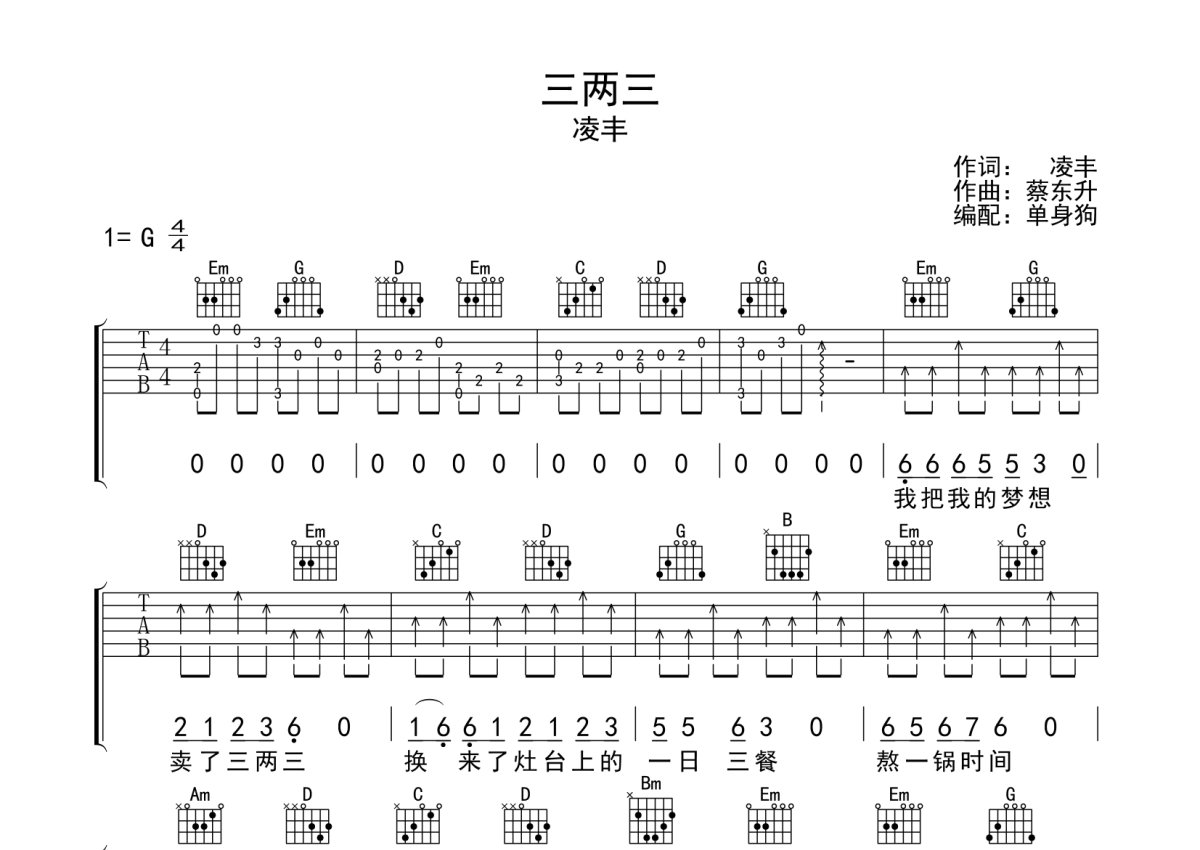 凌丰《三两三》吉他谱 - G调弹唱六线谱