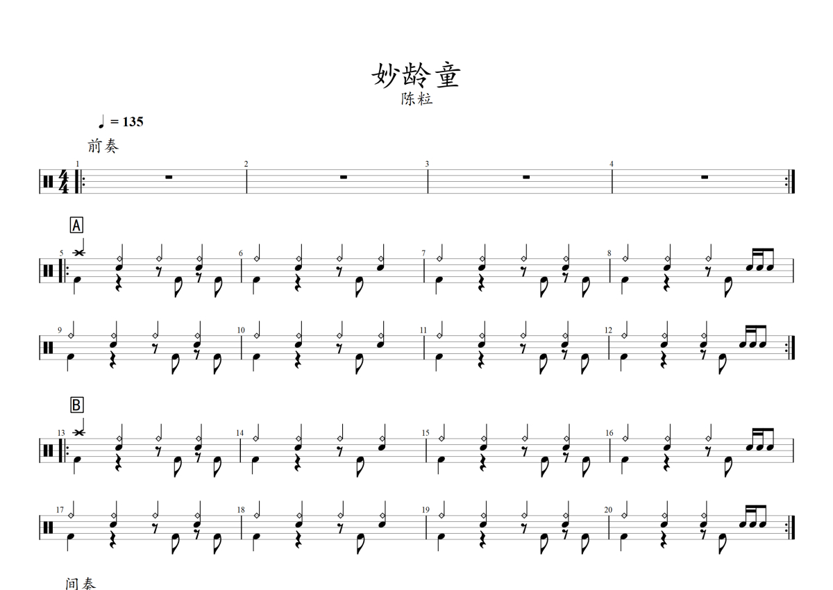 《妙龄童》是陈粒演唱的一首歌曲,拍号为4/4拍,歌曲速度为每分钟135拍,这份架子鼓谱共有两张高清图谱,图谱由 @音符喷血者 编配上传,图谱使用五线谱编配,使用这份妙龄童架子鼓谱,你将能够轻松地敲打出这首陈粒的妙龄童,快来尝试吧。