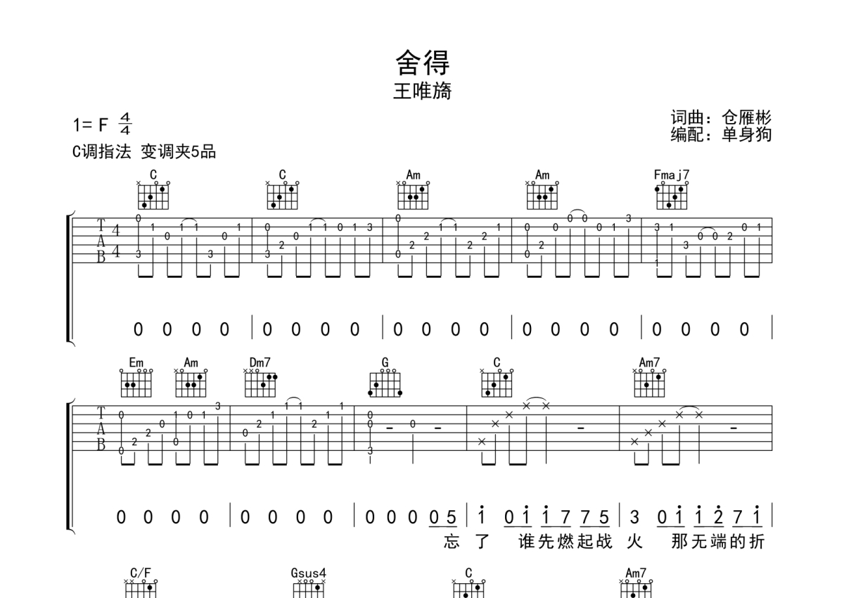 王唯旖《舍得》吉他谱 - C调弹唱六线谱