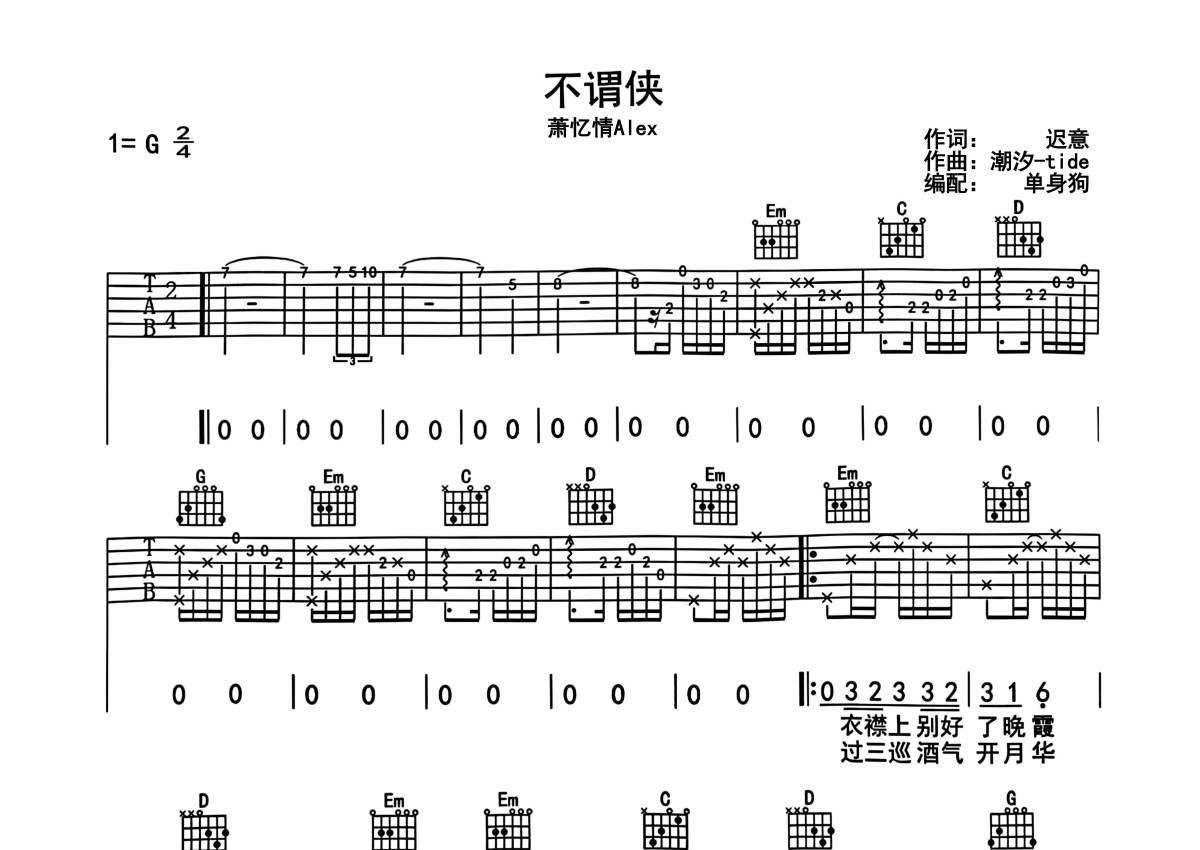 萧忆情Alex《不谓侠》吉他谱 - G调弹唱六线谱