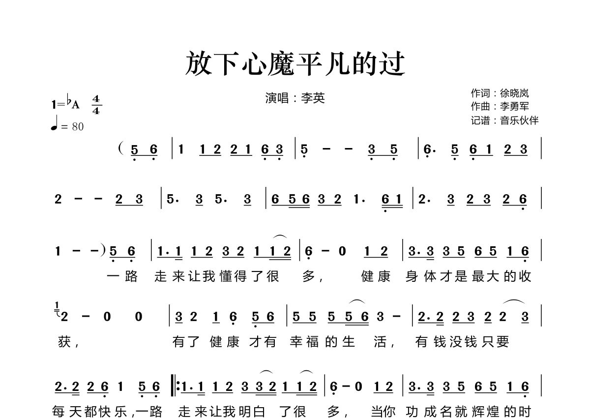 《放下心魔平凡的过》是李英演唱的一首歌曲,拍号为4/4拍,歌曲速度为每分钟80拍,这份简谱共有两张高清图谱,图谱由 @音乐伙伴 编配上传。