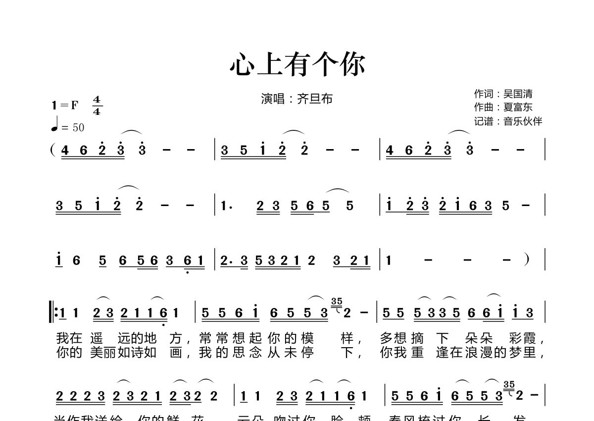 《心上有个你》是齐旦布演唱的一首歌曲,这份简谱共有两张高清图谱,图谱由 @音乐伙伴 编配上传。