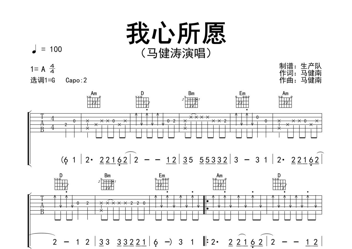 《我心所愿》是马健涛演唱的一首歌曲,精编完美版,拍号为4/4拍,歌曲速度为每分钟100拍,歌曲原调为A调,但由于原调指法比较难,为了方便弹奏,本吉他谱采用的是G调指法编配,变调夹2品弹奏即为原调,当然也可以根据自己的音域改变变调夹位置,或者通过改变和弦调性,以方便自己弹奏,这份吉他谱共有三张高清图谱,图谱由 @生产队 编配上传,图谱使用六线谱编配,包含吉他和弦指法、简谱以及歌词部分,使用这份我心所愿吉他谱,可以让你更加方便地掌握这首歌曲的弹唱技巧,快来尝试吧。马健涛演唱的歌曲《我心所愿》原版吉他谱,完整的前奏、间奏solo编配,精编完美版,值得推荐!。