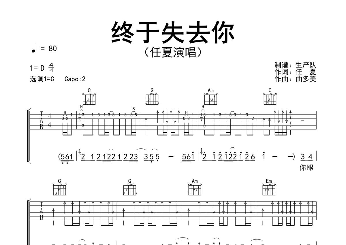 《终于失去你》是任夏演唱的一首歌曲,精编完美版,拍号为4/4拍,歌曲速度为每分钟80拍,歌曲原调为D调,但由于原调指法比较难,为了方便弹奏,本吉他谱采用的是C调指法编配,变调夹2品弹奏即为原调,当然也可以根据自己的音域改变变调夹位置,或者通过改变和弦调性,以方便自己弹奏,这份吉他谱共有三张高清图谱,图谱由 @生产队 编配上传,图谱使用六线谱编配,包含吉他和弦指法、简谱以及歌词部分,使用这份终于失去你吉他谱,可以让你更加方便地掌握这首歌曲的弹唱技巧,快来尝试吧。任夏作词、作曲并演唱的歌曲《终于失去你》原版吉他谱,精准的前奏、间奏、尾奏solo编配,精编完美版,值得推荐!。