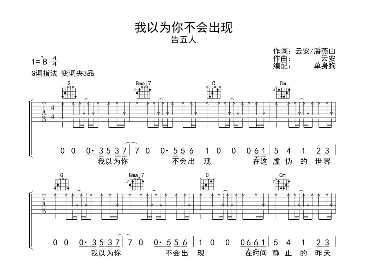 《我以为你不会出现》是告五人演唱的一首歌曲,本吉他谱采用的是G调指法编配,这份吉他谱共有四张高清图谱,图谱由 @单身狗 编配上传,图谱使用六线谱编配,包含吉他和弦指法、简谱以及歌词部分,使用这份我以为你不会出现吉他谱,可以让你更加方便地掌握这首歌曲的弹唱技巧,快来尝试吧。告五人《我以为你不会出现》吉他弹唱谱,采用G调指法编配,单身狗编配出品,共有4张高清图谱。