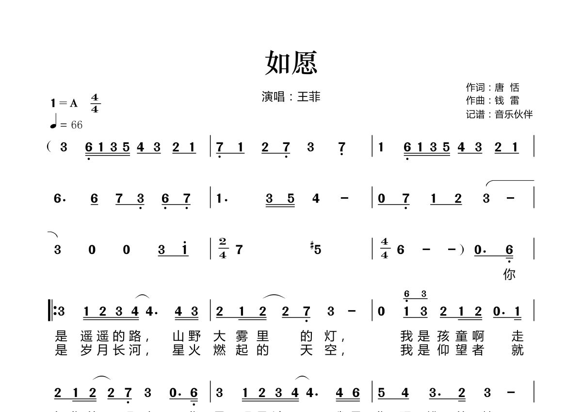 《如愿》是王菲演唱的一首歌曲,拍号为4/4拍,歌曲速度为每分钟66拍,这份简谱共有两张高清图谱,图谱由 @音乐伙伴 编配上传。