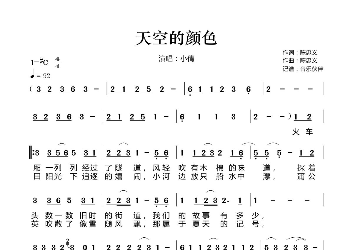 《天空的颜色》是小倩演唱的一首歌曲,拍号为4/4拍,歌曲速度为每分钟92拍,这份简谱共有两张高清图谱,图谱由 @音乐伙伴 编配上传。