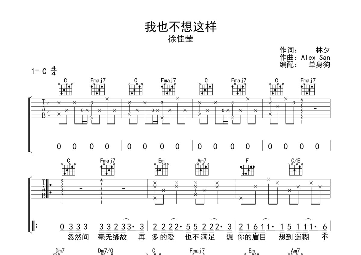 《我也不想这样》是徐佳莹演唱的一首歌曲,本吉他谱采用的是C调指法编配,这份吉他谱共有三张高清图谱,图谱由 @单身狗 编配上传,图谱使用六线谱编配,包含吉他和弦指法、简谱以及歌词部分,使用这份我也不想这样吉他谱,可以让你更加方便地掌握这首歌曲的弹唱技巧,快来尝试吧。徐佳莹《我也不想这样》吉他弹唱谱,采用C调指法编配,单身狗编配出品,共有3张高清图谱。