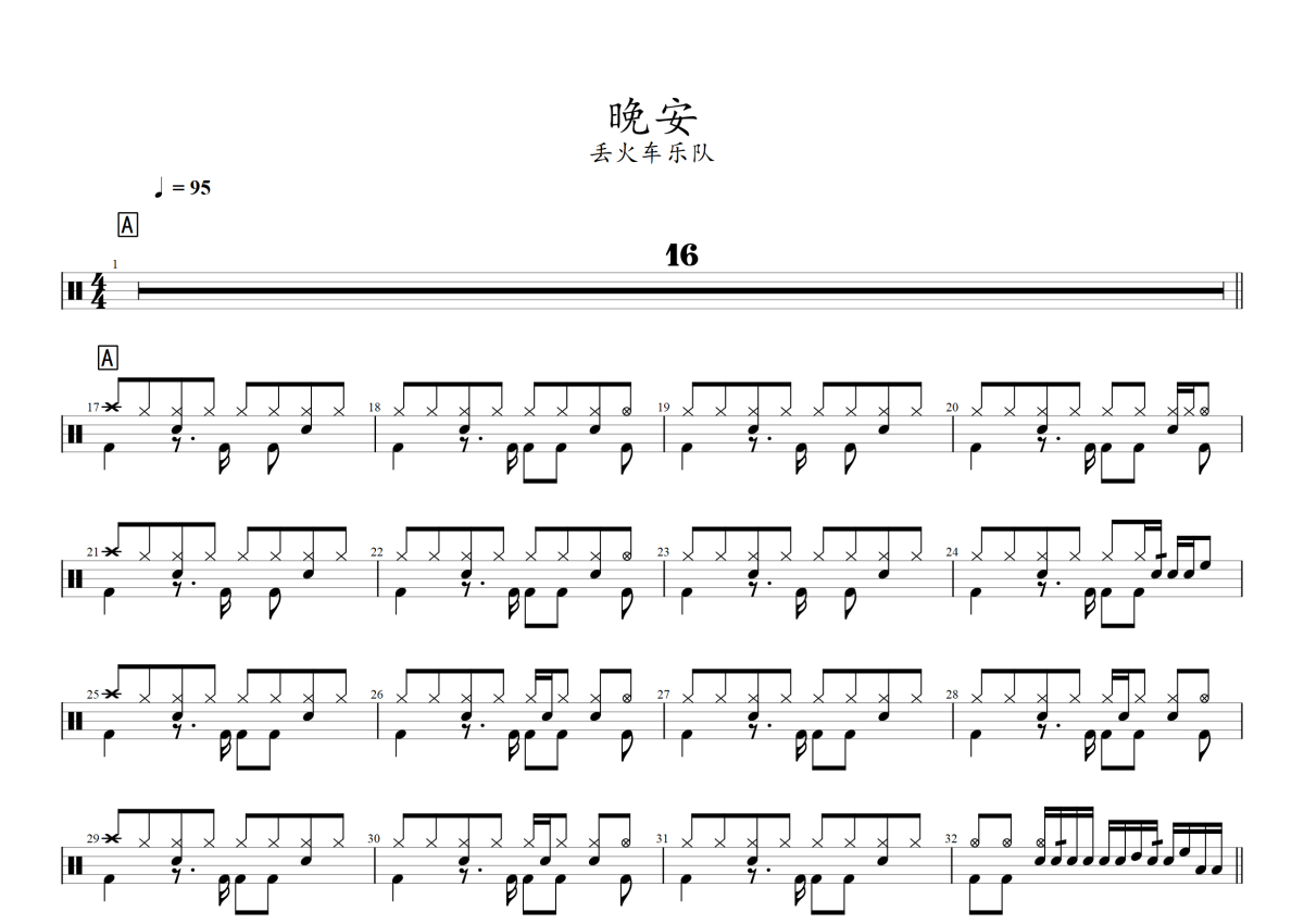 《晚安》是丢火车乐队演唱的一首歌曲,拍号为4/4拍,歌曲速度为每分钟95拍,这份架子鼓谱共有两张高清图谱,图谱由 @音符喷血者 编配上传,图谱使用五线谱编配,使用这份晚安架子鼓谱,你将能够轻松地敲打出这首丢火车乐队的晚安,快来尝试吧。