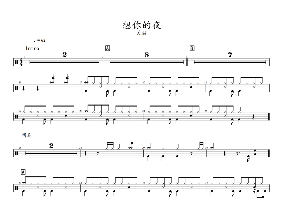 关喆《想你的夜》架子鼓谱