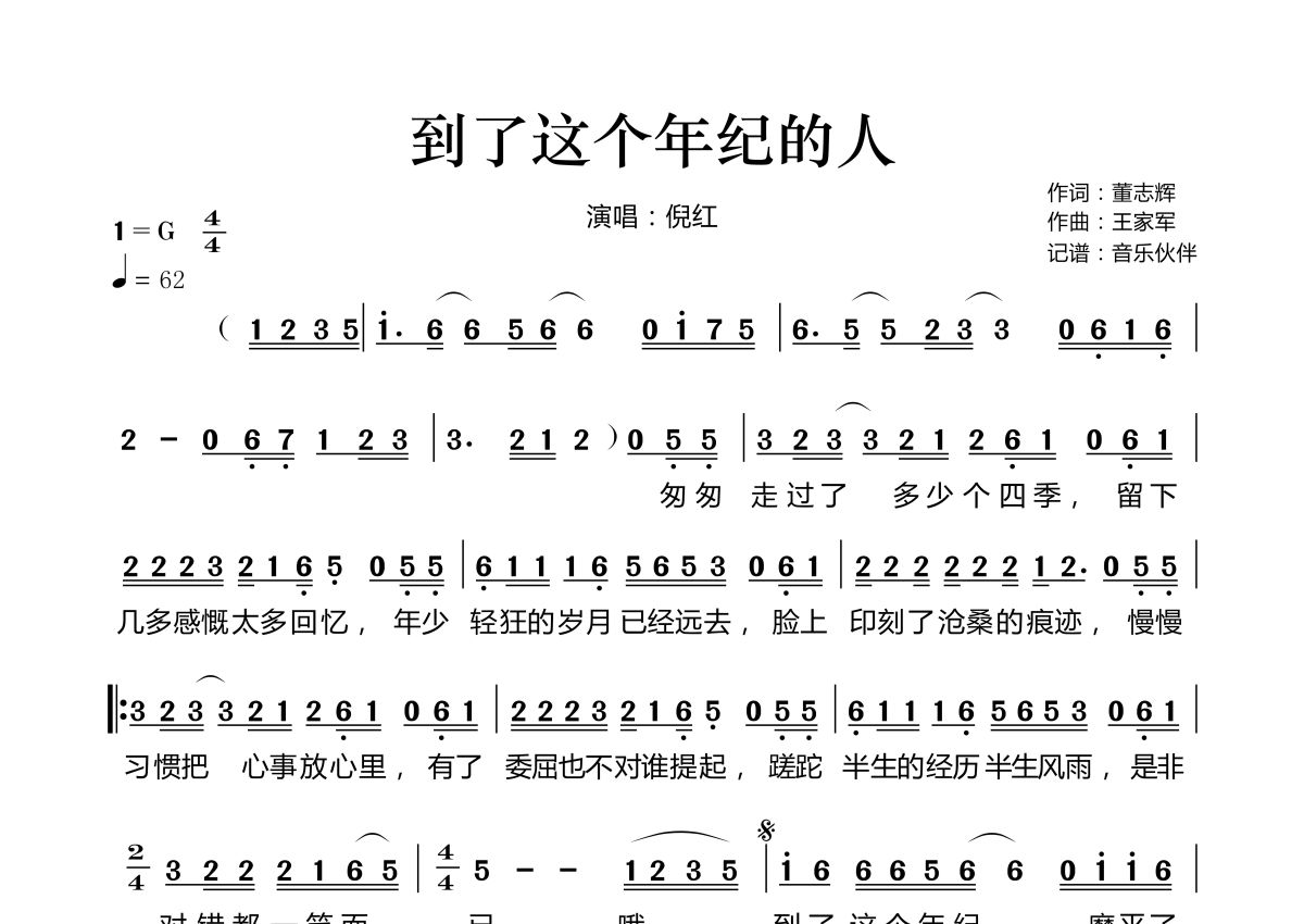 《到了这个年纪的人》是倪红演唱的一首歌曲,拍号为4/4拍,歌曲速度为每分钟62拍,这份简谱共有一张高清图谱,图谱由 @音乐伙伴 编配上传。
