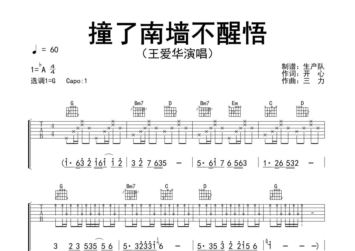 《撞了南墙不醒悟》是王爱华演唱的一首歌曲,精编完美版,拍号为4/4拍,歌曲速度为每分钟60拍,歌曲原调为Ab调,但由于原调指法比较难,为了方便弹奏,本吉他谱采用的是G调指法编配,变调夹1品弹奏即为原调,当然也可以根据自己的音域改变变调夹位置,或者通过改变和弦调性,以方便自己弹奏,这份吉他谱共有三张高清图谱,图谱由 @生产队 编配上传,图谱使用六线谱编配,包含吉他和弦指法、简谱以及歌词部分,使用这份撞了南墙不醒悟吉他谱,可以让你更加方便地掌握这首歌曲的弹唱技巧,快来尝试吧。王爱华演唱的歌曲《撞了南墙不醒悟》原版吉他谱,精准的前奏、间奏、尾奏solo编配,精编完美版,值得推荐!。
