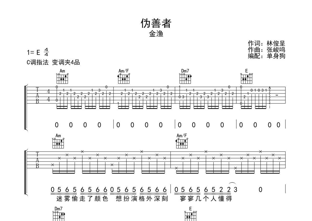 金渔《伪善者》吉他谱 - C调弹唱六线谱