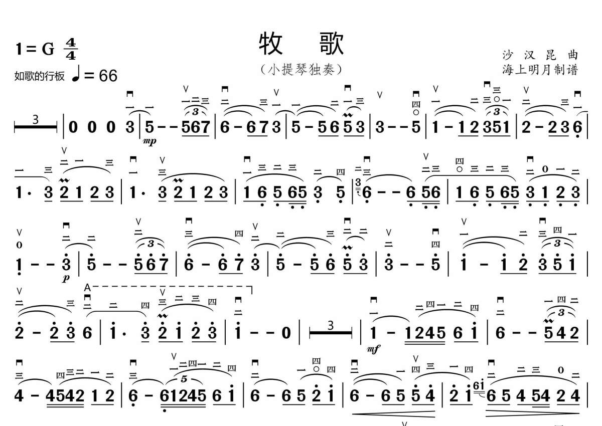《牧歌》是沙汉昆演唱的一首歌曲,简谱,这份小提琴谱共有一张高清图谱,图谱由 @海上明月 编配上传。