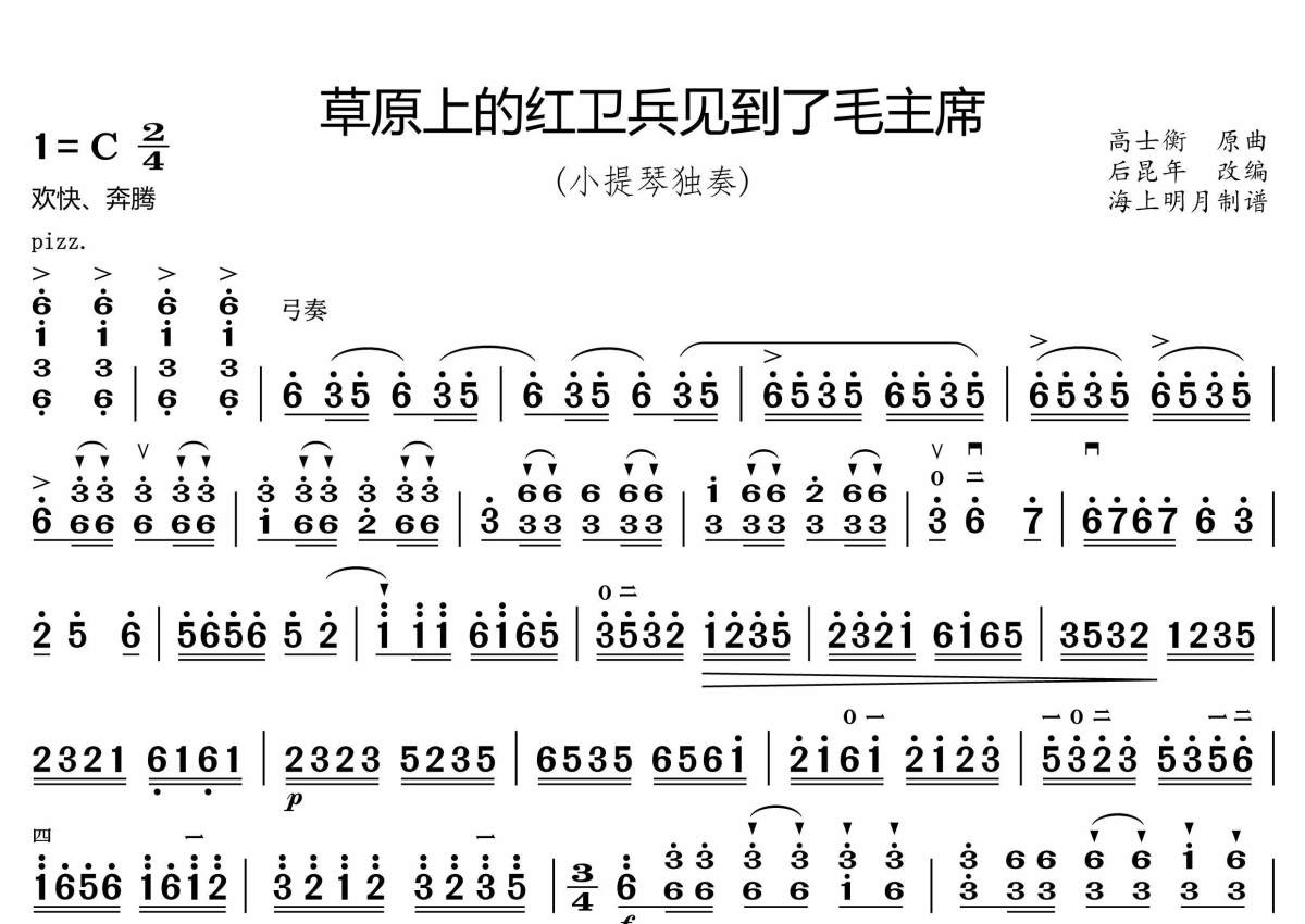 《草原上的红卫兵见到了毛主席》是高士衡原曲,后昆年改编演唱的一首歌曲,简谱,这份小提琴谱共有三张高清图谱,图谱由 @海上明月 编配上传。