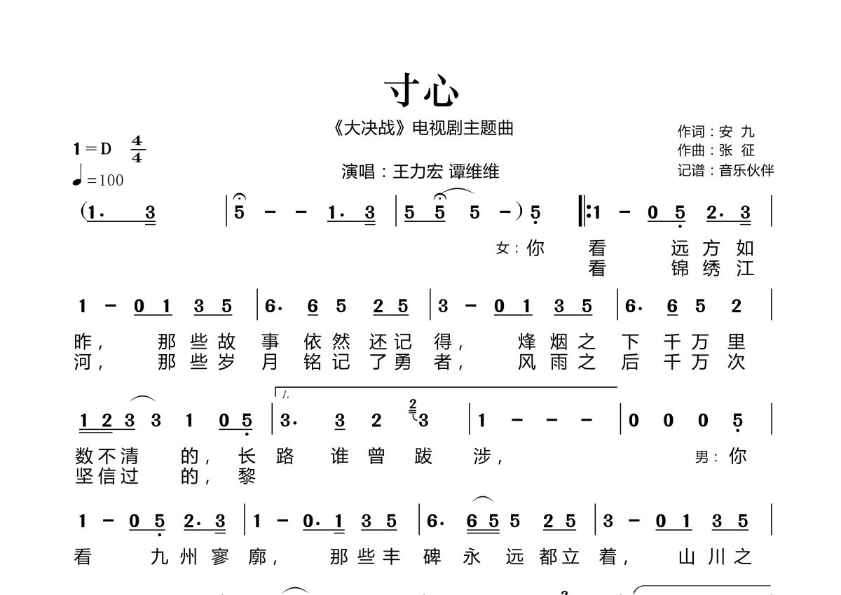 《寸心》是王力宏 谭维维演唱的一首歌曲,拍号为4/4拍,歌曲速度为每分钟100拍,这份简谱共有两张高清图谱,图谱由 @音乐伙伴 编配上传。