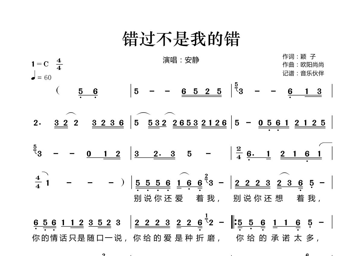 《错过不是我的错》是安静演唱的一首歌曲,拍号为4/4拍,歌曲速度为每分钟60拍,这份简谱共有两张高清图谱,图谱由 @音乐伙伴 编配上传。