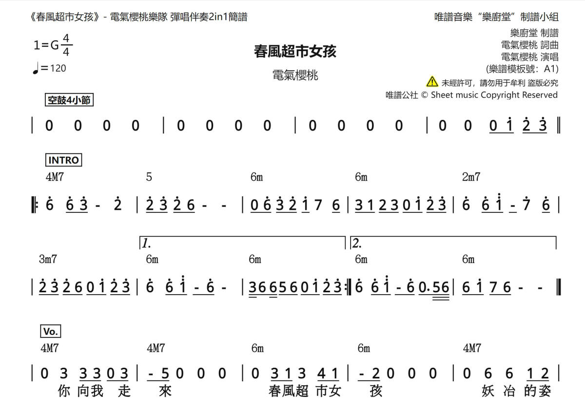《春风超市女孩》是电气樱桃演唱的一首歌曲,和弦简谱,这份简谱共有两张高清图谱,图谱由 @唯谱音乐"乐厨堂"发布小组 编配上传。