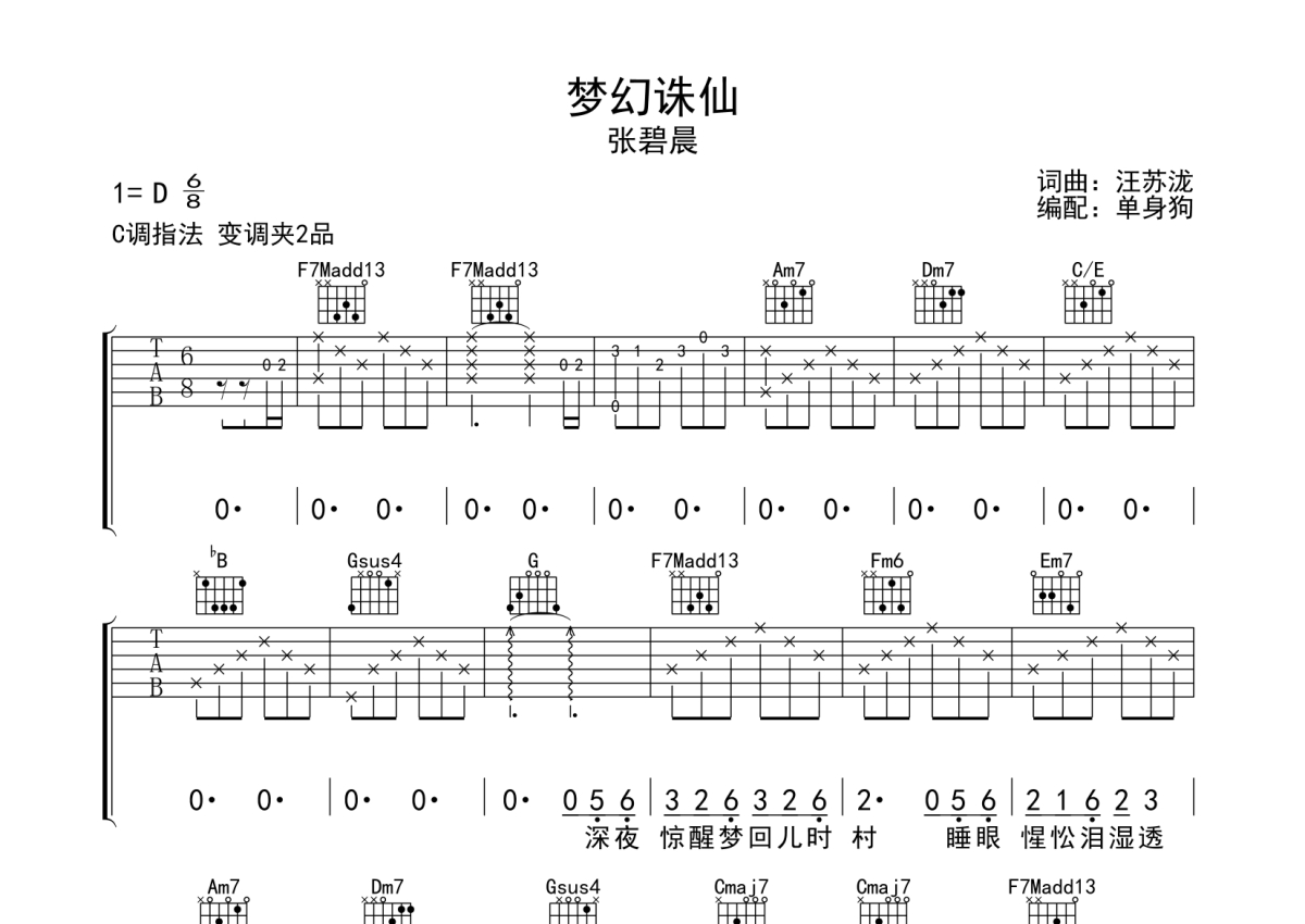 《梦幻诛仙》是张碧晨演唱的一首歌曲,拍号为6/8拍,歌曲原调为D调,但由于原调指法比较难,为了方便弹奏,本吉他谱采用的是C调指法编配,变调夹2品弹奏即为原调,当然也可以根据自己的音域改变变调夹位置,或者通过改变和弦调性,以方便自己弹奏,这份吉他谱共有三张高清图谱,图谱由 @单身狗 编配上传,图谱使用六线谱编配,包含吉他和弦指法、简谱以及歌词部分,使用这份梦幻诛仙吉他谱,可以让你更加方便地掌握这首歌曲的弹唱技巧,快来尝试吧。