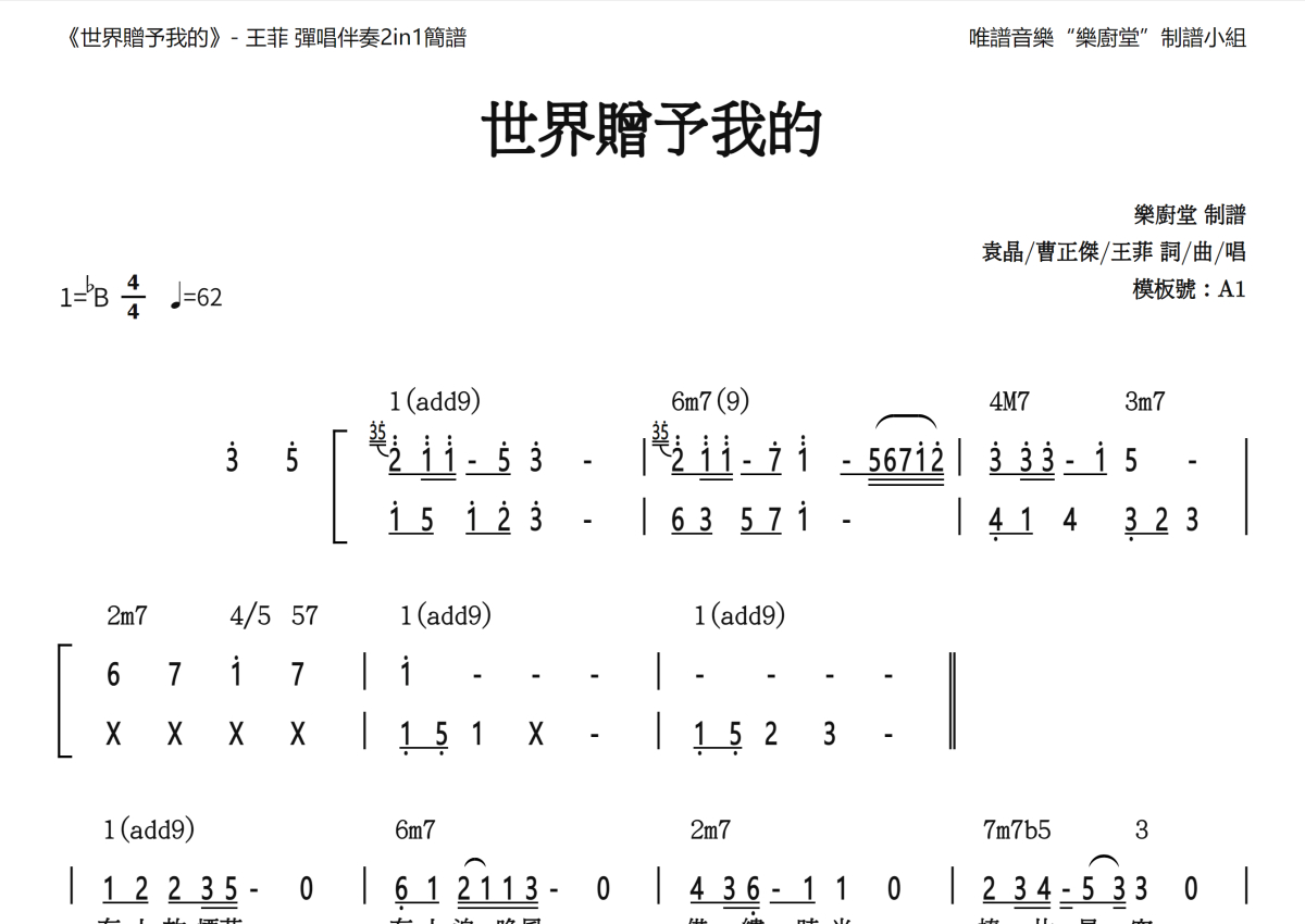 《世界赠予我的》是王菲演唱的一首歌曲,和弦简谱,这份简谱共有两张高清图谱,图谱由 @唯谱音乐"乐厨堂"发布小组 编配上传。