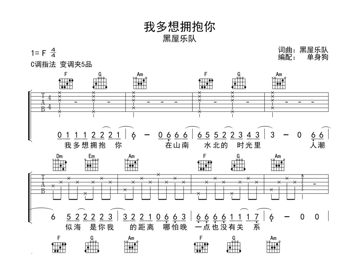 黑屋乐队《我多想拥抱你》吉他谱 - C调弹唱六线谱