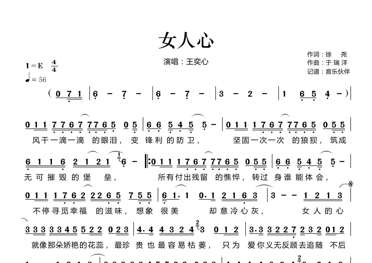 《女人心》是王奕心演唱的一首歌曲,这份简谱共有一张高清图谱,图谱由 @音乐伙伴 编配上传。