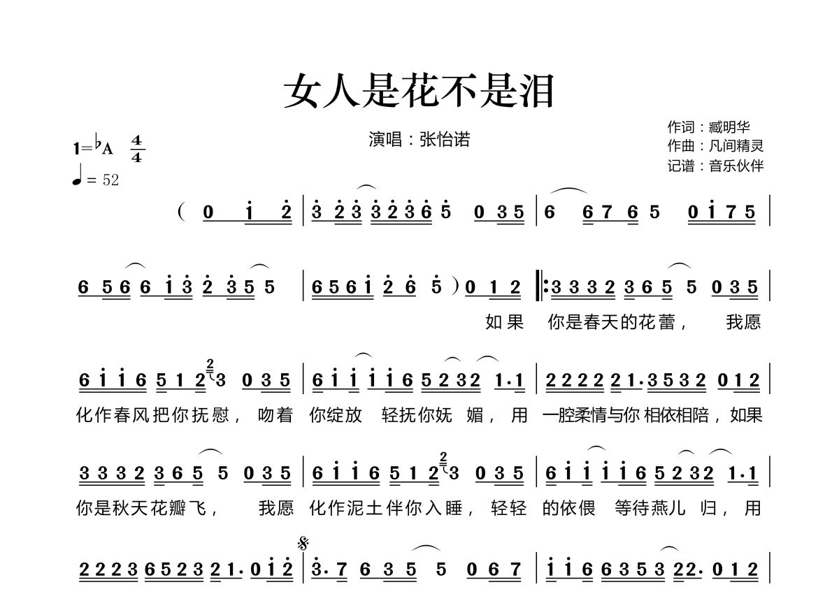 女人是花不是泪简谱 - 张怡诺演唱