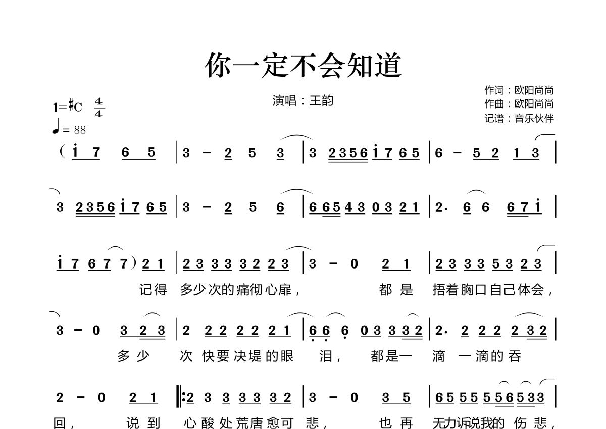 《你一定不会知道》是王韵演唱的一首歌曲,拍号为4/4拍,歌曲速度为每分钟88拍,这份简谱共有两张高清图谱,图谱由 @音乐伙伴 编配上传。
