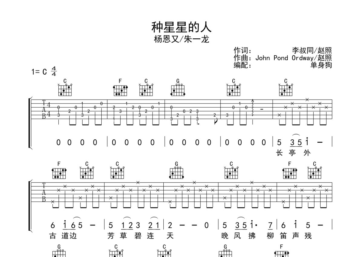 《种星星的人》是杨恩又/朱一龙演唱的一首歌曲,本吉他谱采用的是C调指法编配,这份吉他谱共有三张高清图谱,图谱由 @单身狗 编配上传,图谱使用六线谱编配,包含吉他和弦指法、简谱以及歌词部分,使用这份种星星的人吉他谱,可以让你更加方便地掌握这首歌曲的弹唱技巧,快来尝试吧。杨恩又/朱一龙《种星星的人》吉他弹唱谱,采用C调指法编配,单身狗编配出品,共有3张高清图谱。