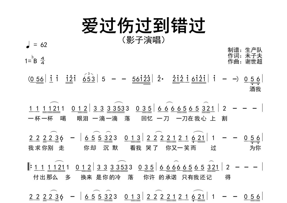 《爱过伤过到错过》是影子演唱的一首歌曲,原版简谱,拍号为4/4拍,歌曲速度为每分钟62拍,这份简谱共有一张高清图谱,图谱由 @生产队 编配上传影子演唱的歌曲《爱过伤过到错过》原版简谱,精准的前奏、间奏、尾奏solo编配。