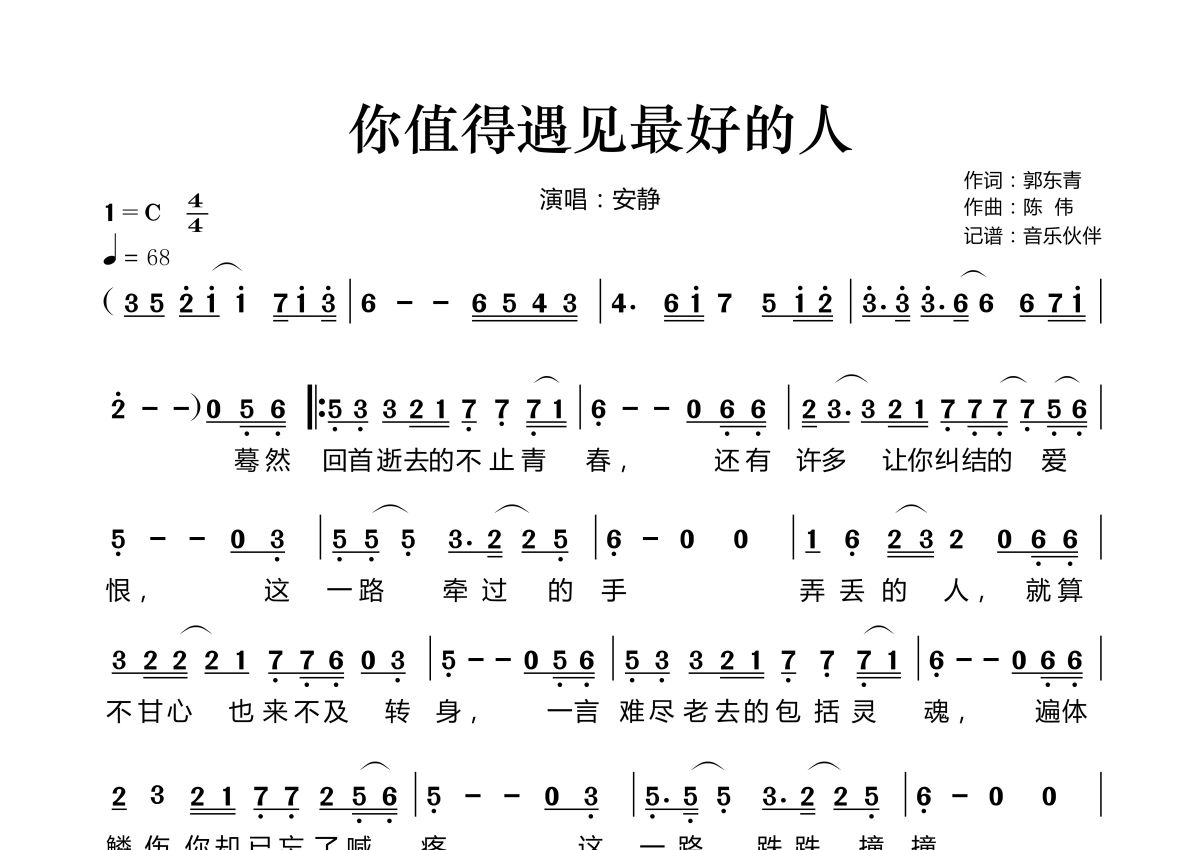 《你值得遇见最好的人》是安静演唱的一首歌曲,拍号为4/4拍,歌曲速度为每分钟68拍,这份简谱共有两张高清图谱,图谱由 @音乐伙伴 编配上传。