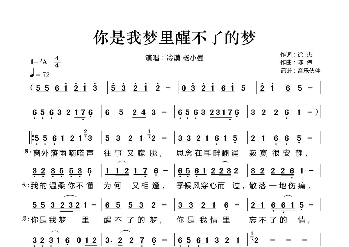 你是我梦里醒不了的梦简谱 - 冷漠 杨小曼演唱