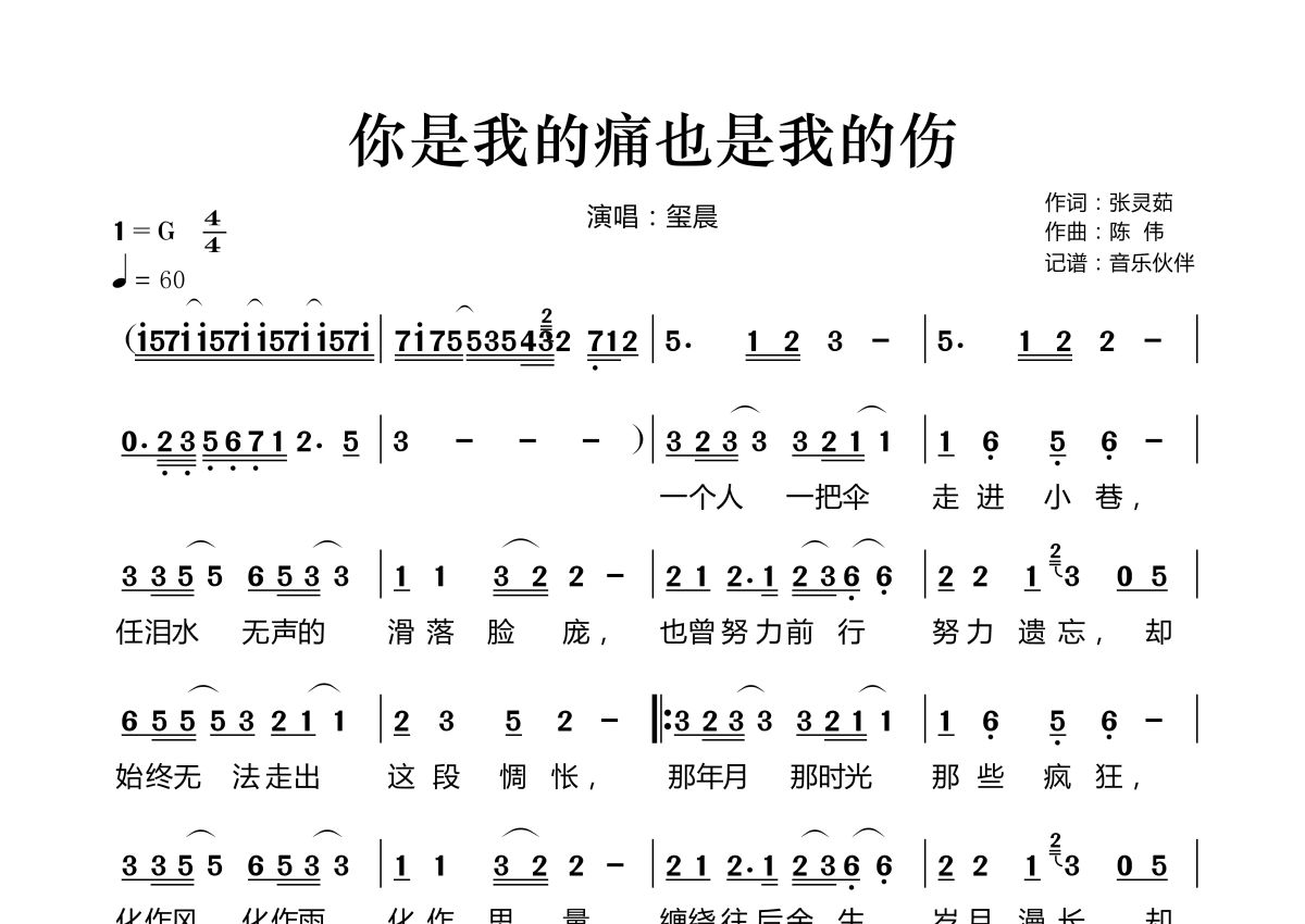 《你是我的痛也是我的伤》是玺晨演唱的一首歌曲,拍号为4/4拍,歌曲速度为每分钟60拍,这份简谱共有两张高清图谱,图谱由 @音乐伙伴 编配上传。