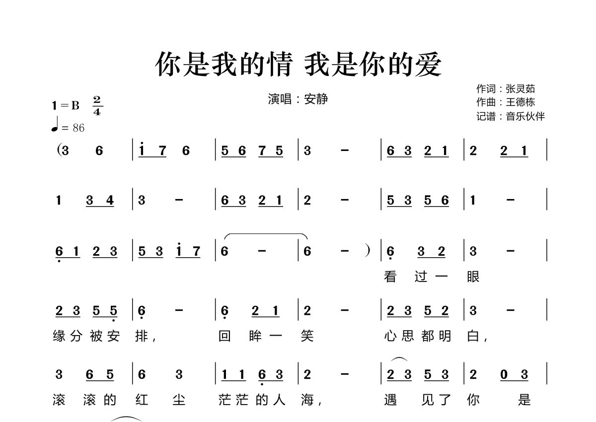 《你是我的情我是你的爱》是安静演唱的一首歌曲,拍号为2/4拍,歌曲速度为每分钟86拍,这份简谱共有两张高清图谱,图谱由 @音乐伙伴 编配上传。