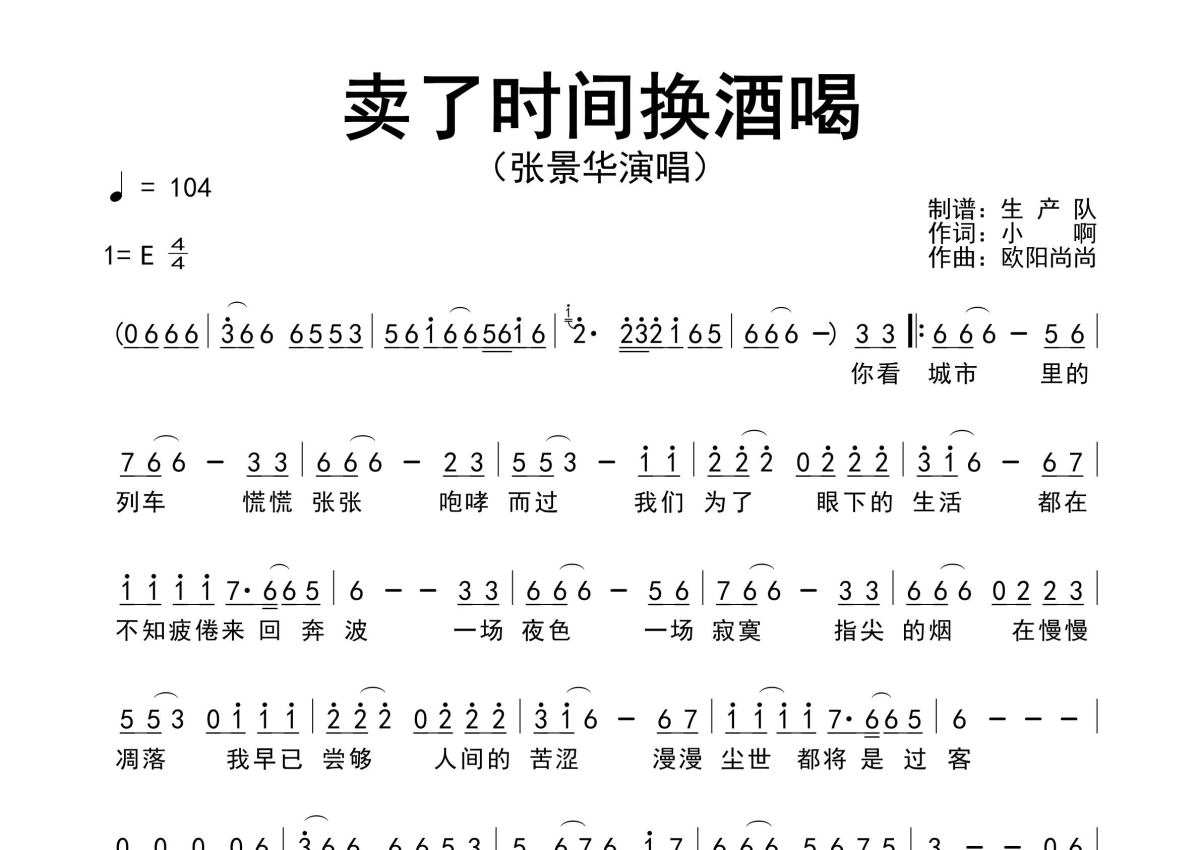 《卖了时间换酒喝》是张景华演唱的一首歌曲,原版简谱,拍号为4/4拍,歌曲速度为每分钟104拍,这份简谱共有一张高清图谱,图谱由 @生产队 编配上传张景华演唱的歌曲《卖了时间换酒喝》原版简谱,精准的前奏、间奏、尾奏solo编配。