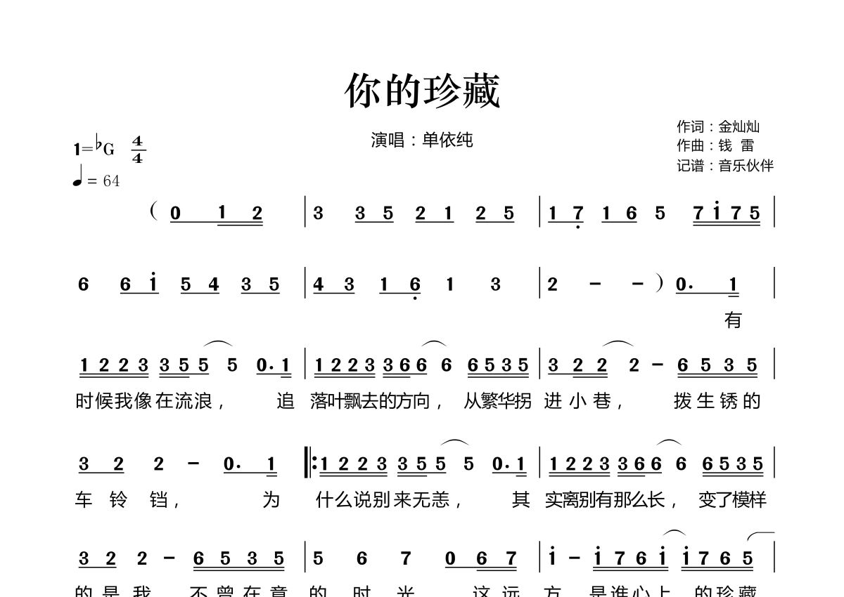 《你的珍藏》是单依纯演唱的一首歌曲,拍号为4/4拍,歌曲速度为每分钟64拍,这份简谱共有两张高清图谱,图谱由 @音乐伙伴 编配上传。